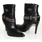 Motorcycle style gets downright chic in this stylish boot. The smooth and sleek leather upper has an edgy studded strap with an antiqued logo plaque topping the shaft. A side zipper allows you to get in and out with ease, while the substantial but wearable heel gives you a lift.